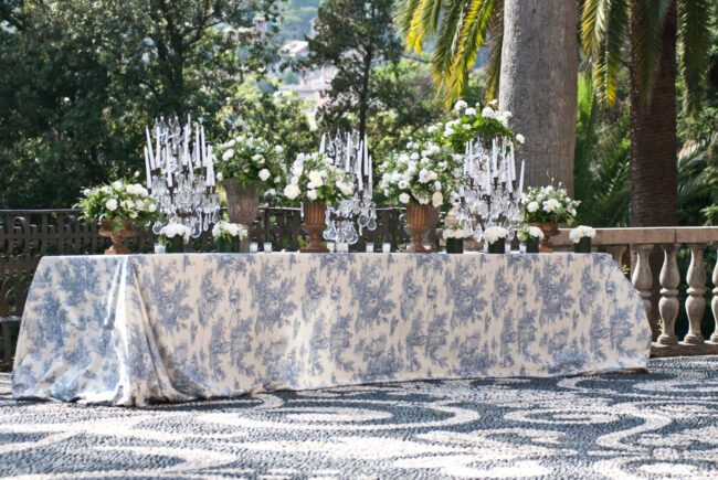 Buffet realizzato con tovagliato toile de jouy. Tessuto in puro cotone con stampa in cromatura blu raffigurante scene di vita contadina. Noleggiala per i tuoi eventi vintage.